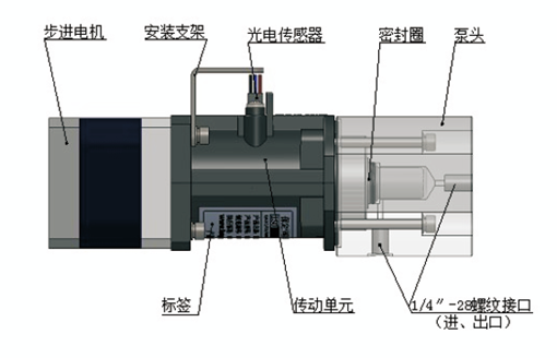 微型柱塞泵通過泵頭的2個1/4''-28內(nèi)螺紋接口,連接進(jìn)、出口管路。
