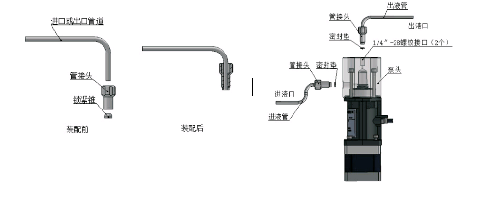 如圖所示,將步驟1連接好的管路,通過管接頭與泵頭的螺紋接口連接,并擰緊管接頭。